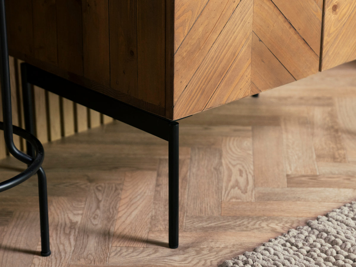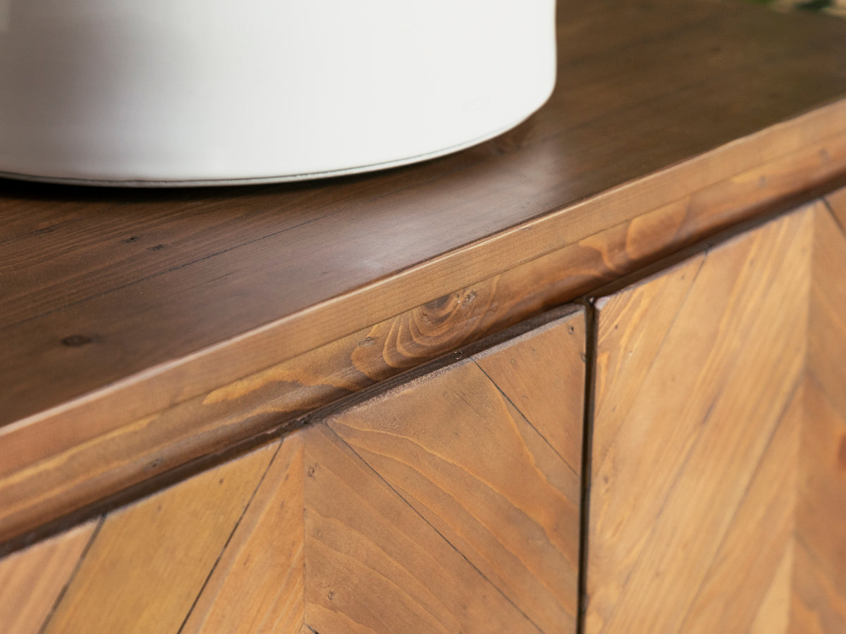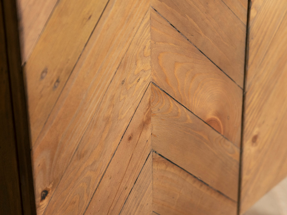 - Motif à chevrons sur le devant, avec grain naturel et variations de tons.