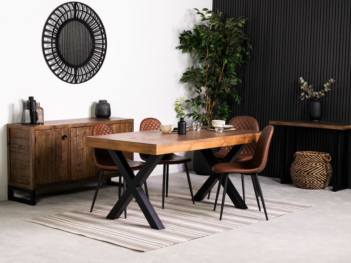 Découvrez la table à manger Brooklyn à plateau fixe de 160 cm avec pieds en métal croisés et les chaises de salle à manger Dallas marron – un duo exceptionnel qui incarne la fusion parfaite entre élégance industrielle et confort contemporain.