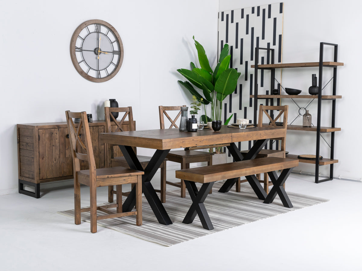 Découvrez le pack table à manger extensible Brooklyn à pieds croisés (140 cm - 180 cm) et chaises de salle à manger Brooklyn de Reclaim Nation : un ensemble sophistiqué qui allie charme rustique et design moderne.