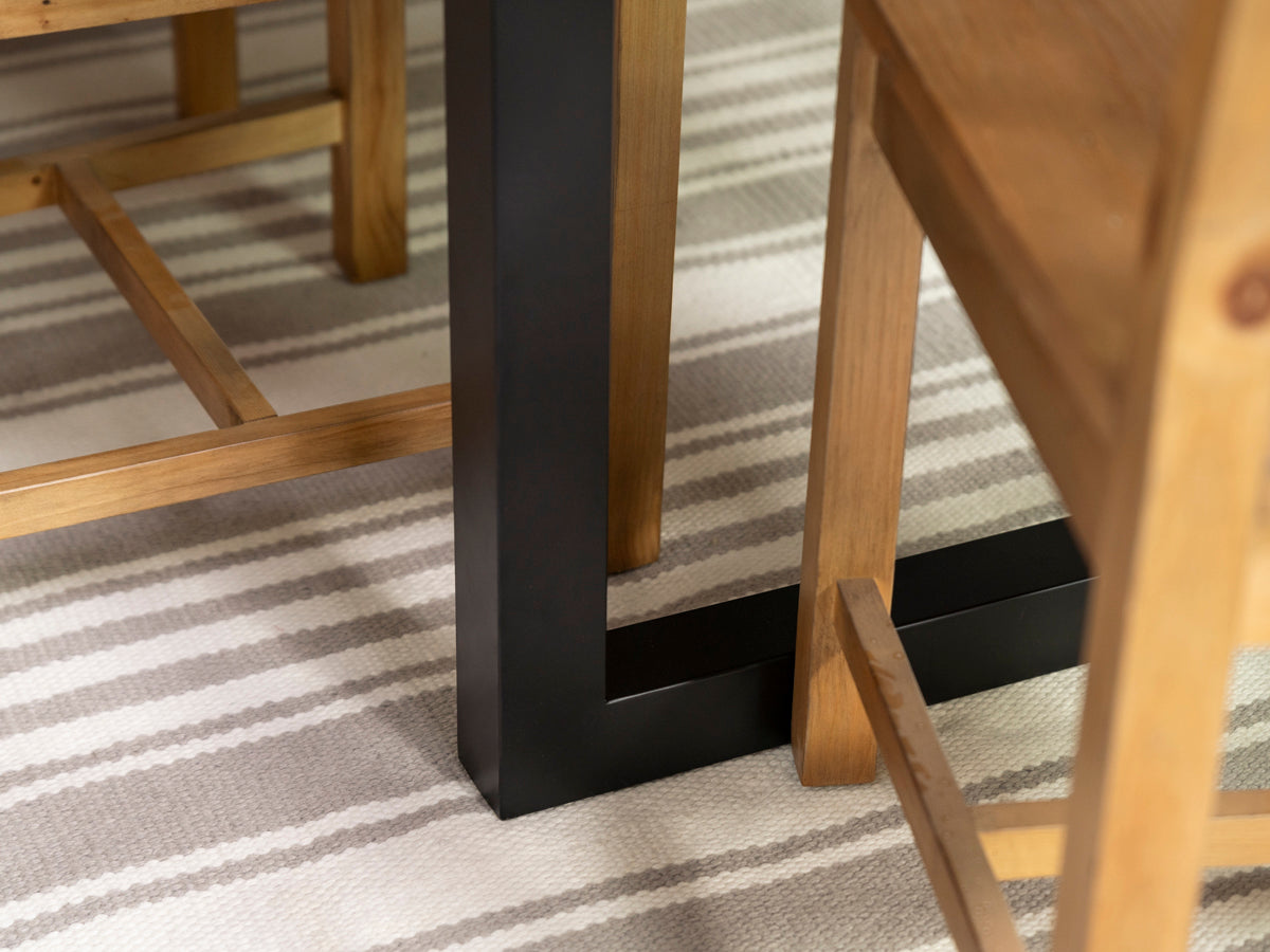 Au cœur de cet ensemble se trouve la table de salle à manger Brooklyn à plateau fixe, fabriquée artisanalement avec soin à partir de bois massif recyclé. Avec son grain naturel, ses nœuds et ses marques uniques, chaque table raconte sa propre histoire. Les pieds en métal noir contrastent avec audace, apportant une touche industrielle qui complète les tons rustiques de la table et lui assure stabilité et robustesse.