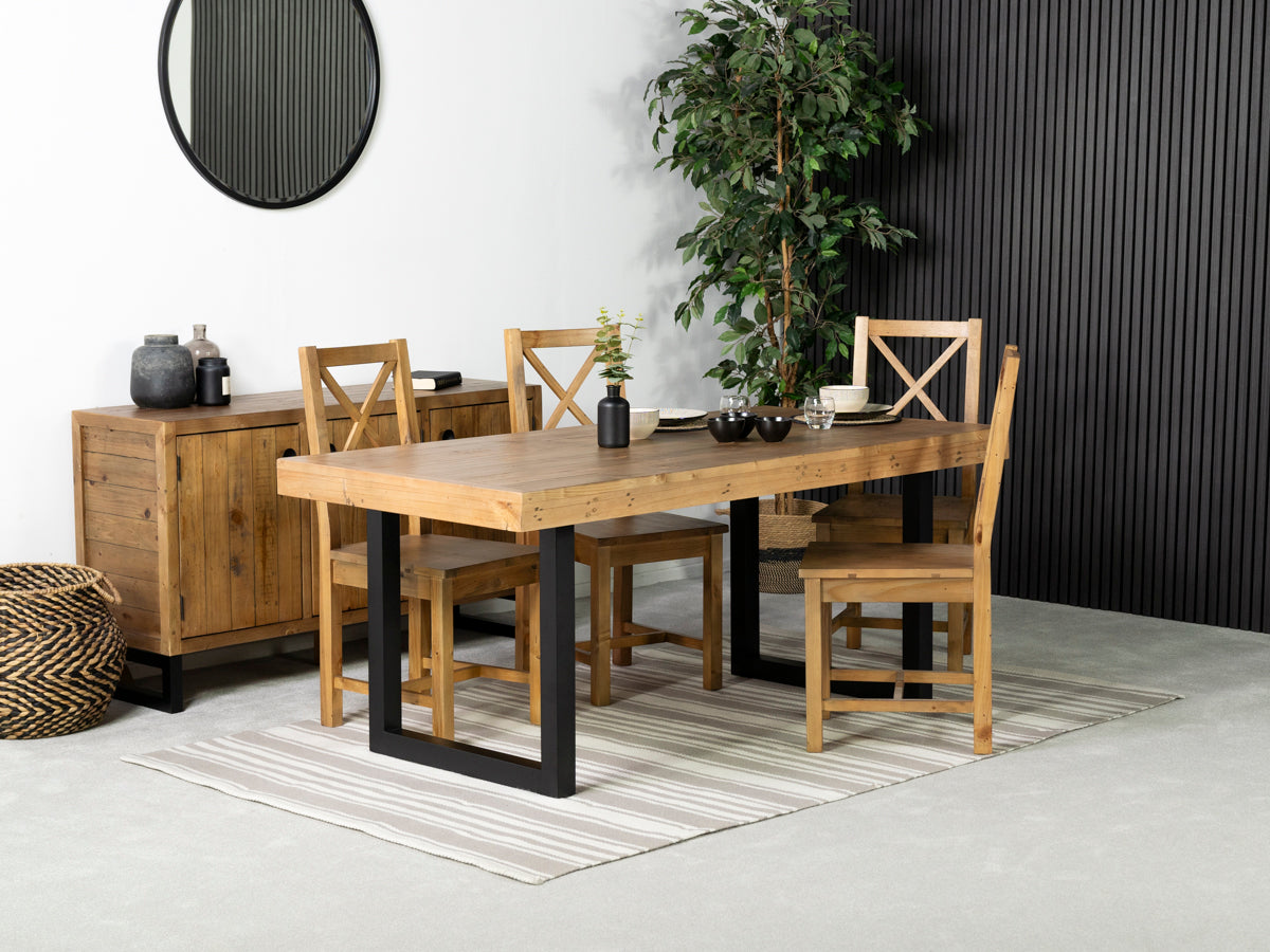 La table de salle à manger Brooklyn Light de 180 cm à plateau fixe est une pièce maîtresse remarquable qui allie harmonieusement le charme rustique à un design industriel. Fabriquée en bois massif recyclé, chaque table présente un veinage, des nœuds et des marques naturelles uniques, ce qui rend chaque pièce unique. Ses pieds en métal noir contrastants lui confèrent une allure contemporaine et audacieuse, faisant de cette table un choix idéal pour les intérieurs modernes comme rustiques.