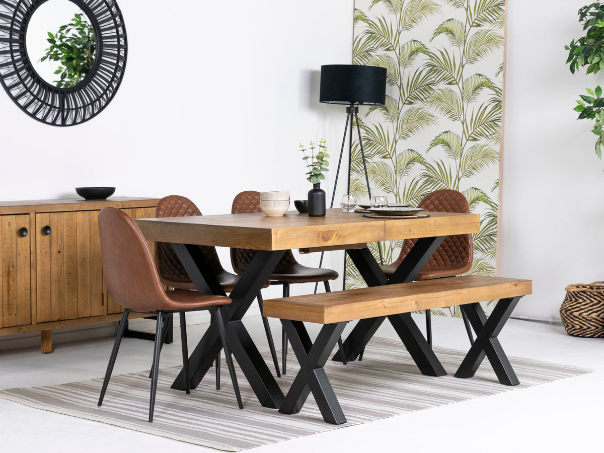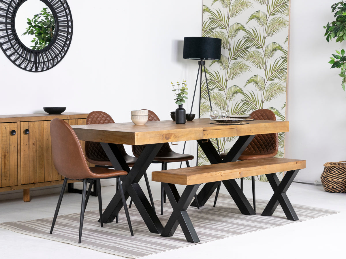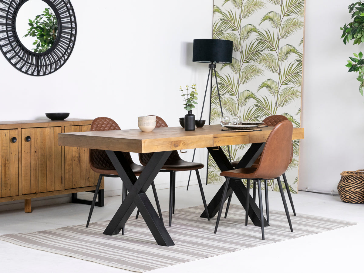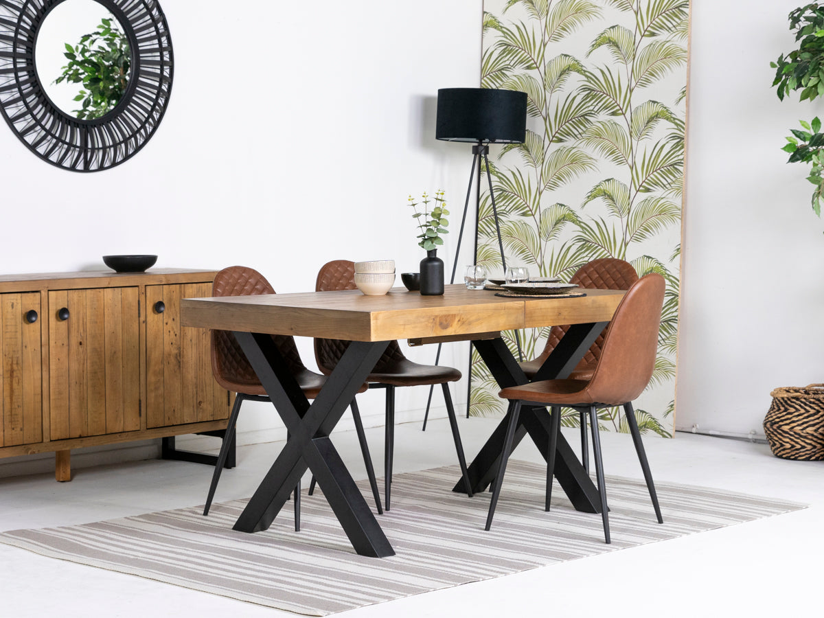Découvrez la table à manger extensible Brooklyn Light à pieds croisés (140 cm - 180 cm) associée aux chaises de salle à manger Tan Dallas : une combinaison magnifique qui allie la chaleur rustique du bois recyclé et la sophistication élégante du design moderne.