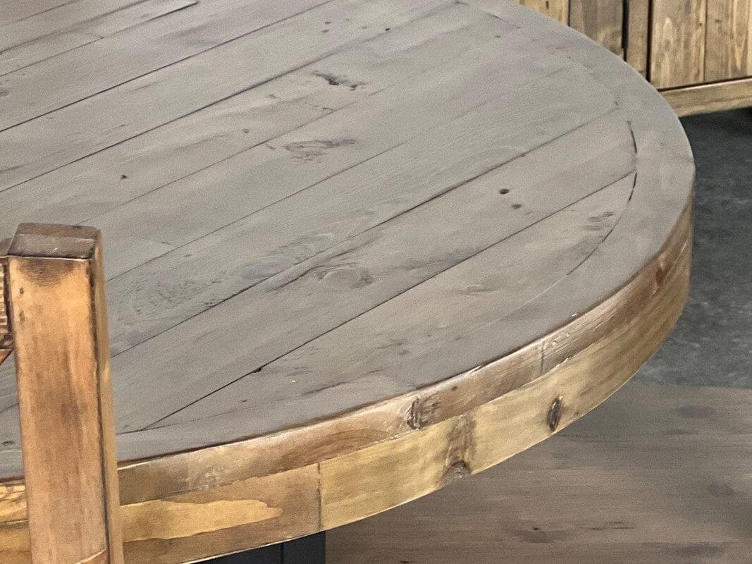 Mettant en valeur une élégante structure métallique, le design de la table contraste subtilement avec le charme naturel des planches de bois recyclé, travaillées artisanalement avec soin et parfaitement intégrées. Ce souci du détail garantit non seulement sa durabilité, mais incarne aussi l'essence même du design rustique moderne, créant une juxtaposition d'éléments saisissante qui captive le regard tout en préservant une composition harmonieuse et cohérente.