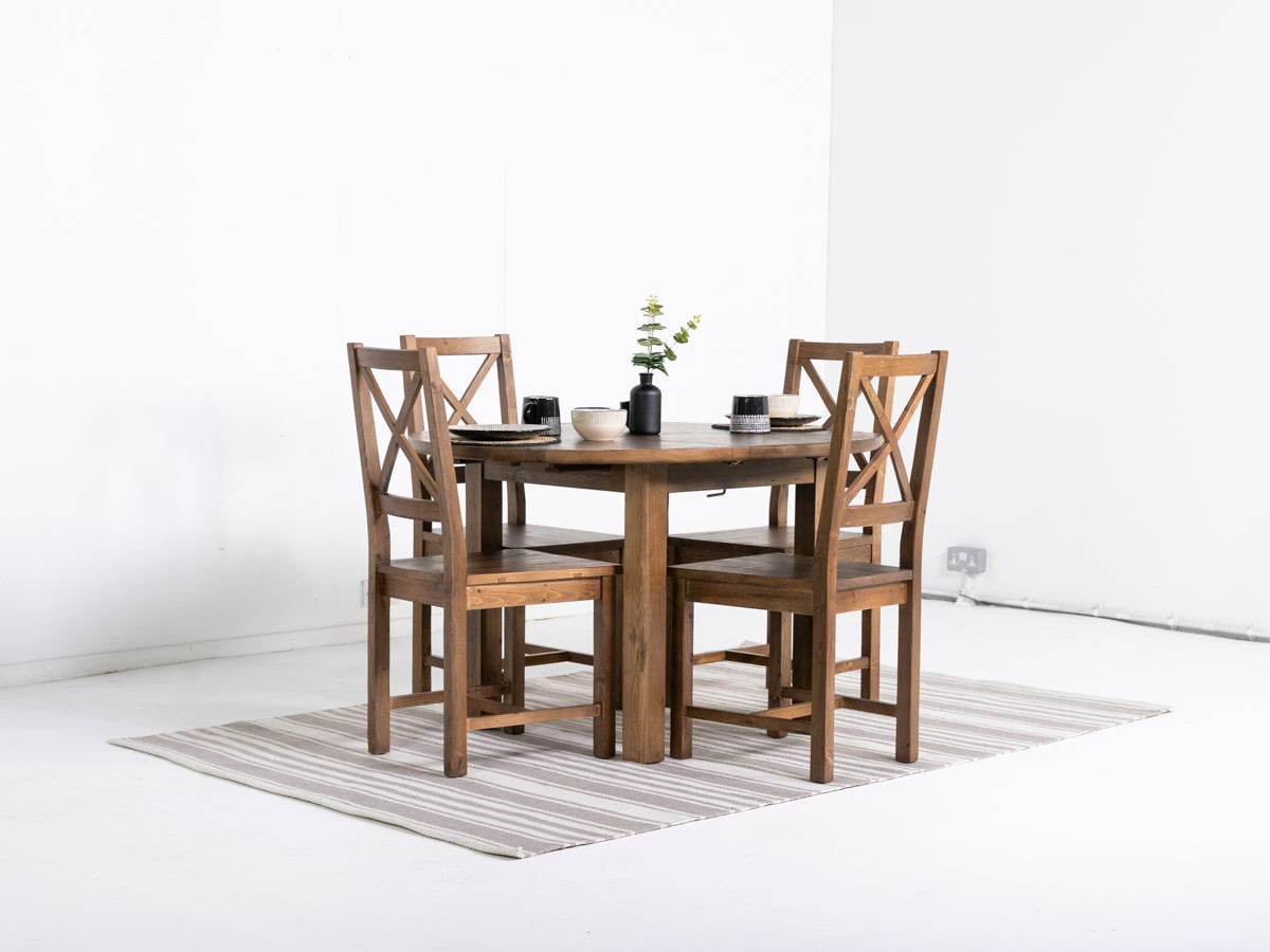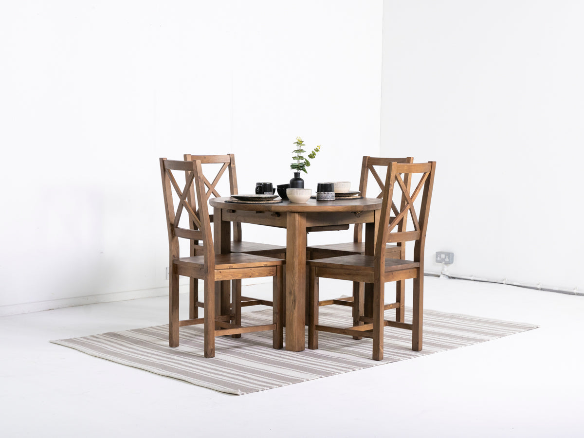 Découvrez l'ensemble table à manger ronde extensible Brooklyn et chaises de salle à manger à dossier croisé Brooklyn — un nouvel ajout à la collection Brooklyn, parfait pour ceux qui apprécient un mélange de charme classique et de design contemporain.