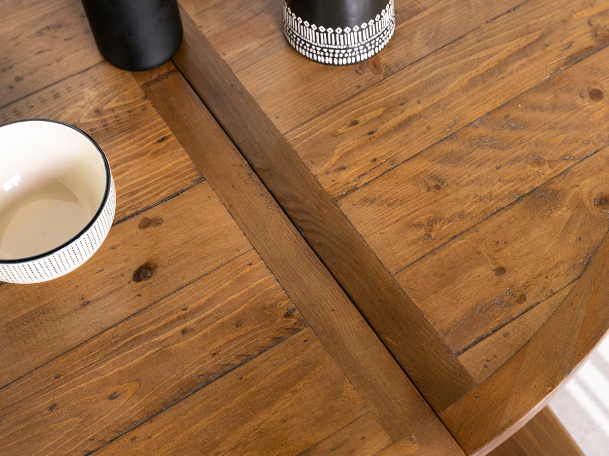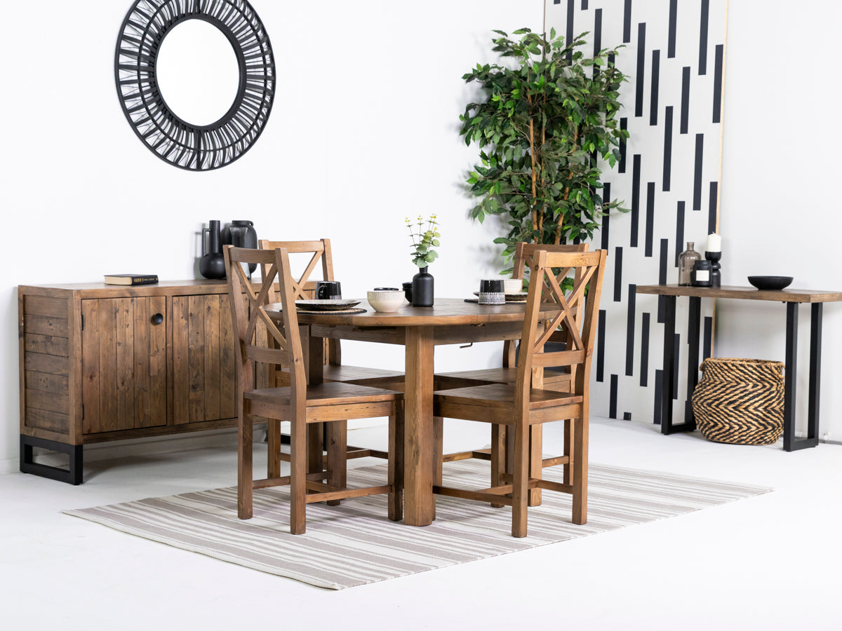 La table à manger extensible ronde Brooklyn et les chaises de salle à manger à dossier croisé créent ensemble une expérience culinaire harmonieuse, où les influences industrielles rencontrent une élégance intemporelle.