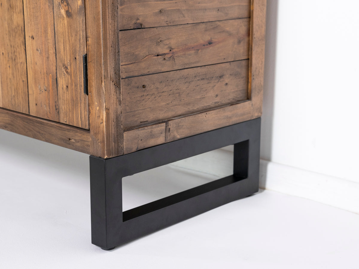 Le charme du buffet Brooklyn réside non seulement dans son design global, mais aussi dans la finesse de ses détails qui s'harmonisent pour créer un ensemble d'une grande cohérence. La finesse de sa structure métallique contraste avec la beauté brute et authentique des planches de bois recyclé. Ces planches, chacune portant les marques de son histoire, sont travaillées artisanalement avec soin pour donner naissance à un meuble à la fois durable et remarquable. L'alliance harmonieuse de ces éléments contrastés témoigne d'un savoir-faire exceptionnel, faisant de ce buffet une pièce à la fois fonctionnelle et véritable incarnation artistique d'une élégance rustique moderne.