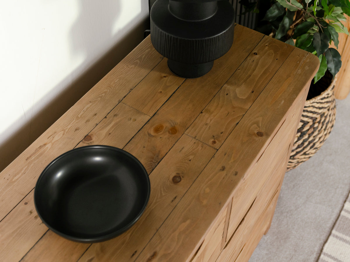 Fabriquée en bois massif recyclé, la commode large Exeter à 7 tiroirs apporte une touche rustique et un espace de rangement pratique à toute chambre. Issue de notre collection Exeter, cette commode est conçue pour affirmer son style avec élégance et discrétion.