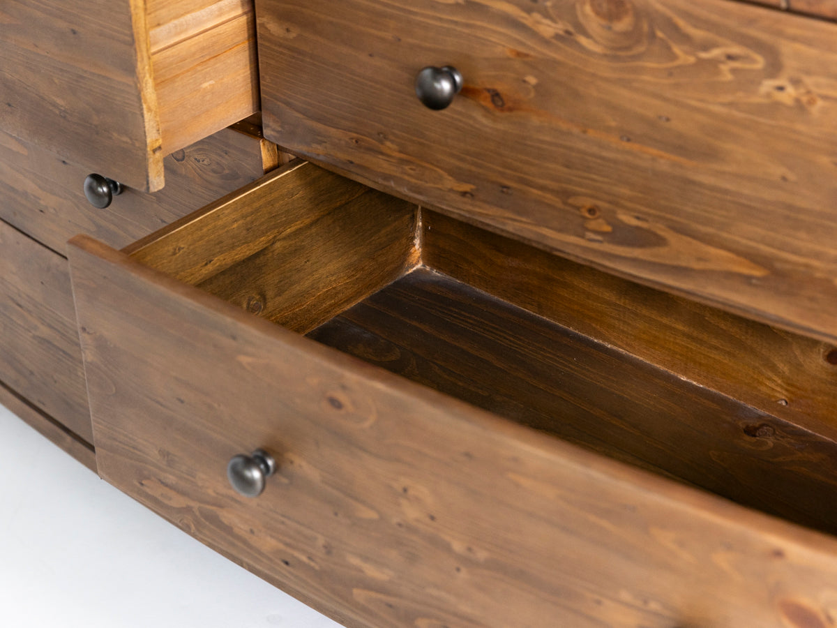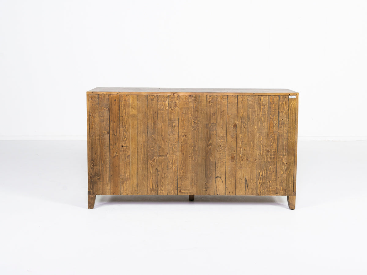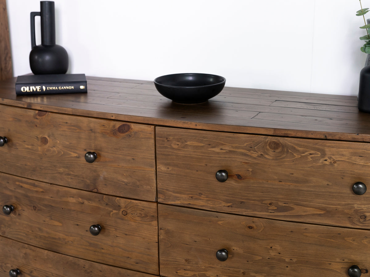 Fabriquée en bois massif recyclé, cette large commode arbore une superbe finition couleur noix de cajou qui met en valeur le grain naturel, garantissant ainsi que chaque pièce est aussi unique que l'espace qu'elle orne.