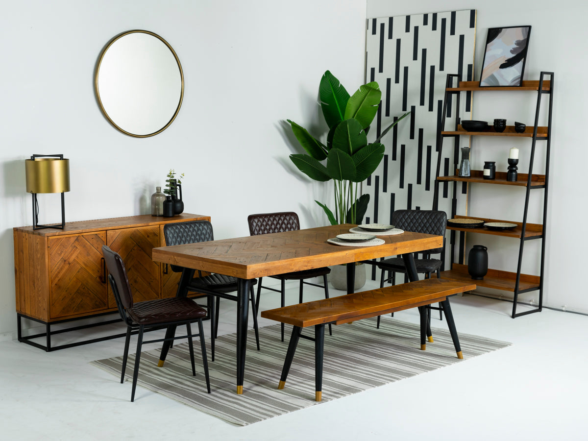 Conçue avec précision et soin, la table de salle à manger extensible Mode allie élégance rustique et raffinement moderne. Fabriquée en bois massif recyclé authentique, chaque table est unique et son plateau à chevrons témoigne du savoir-faire artisanal qui a présidé à sa création.