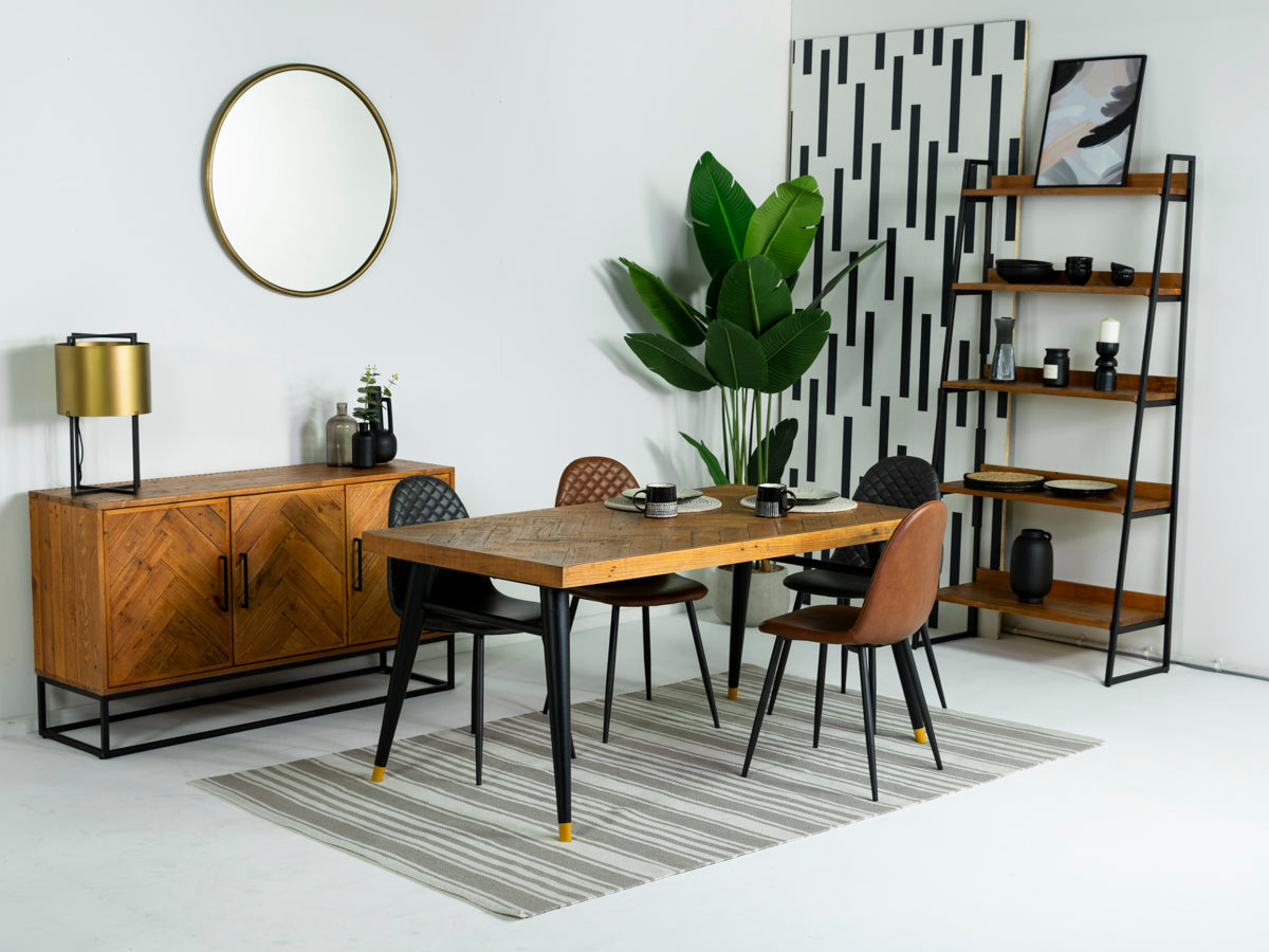 Au cœur de cet ensemble se trouve la table de salle à manger extensible Mode, une incarnation remarquable de l'élégance rustique et du design durable. Fabriquée en bois massif recyclé authentique, chaque pièce de cette collection possède un caractère unique, s'intégrant parfaitement à l'univers Mode. Le plateau à chevrons témoigne du savoir-faire artisanal, mettant en valeur l'authenticité du bois recyclé et invitant les convives à admirer le jeu captivant des tons et des textures. Les pieds évasés en bois recyclé, revêtus d'une élégante teinte beige et ornés d'embouts dorés, apportent une touche de modernité à cette pièce intemporelle, sublimant tout espace repas avec style et durabilité.