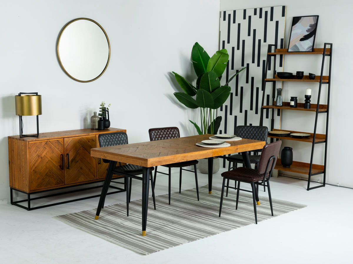 Au cœur de cet ensemble trône la table à manger Mode, une pièce maîtresse captivante façonnée à partir de bois massif recyclé authentique. Son plateau à chevrons révèle la richesse du patrimoine du bois, dont les nœuds et les veines racontent des histoires uniques. Reposant sur des pieds évasés en bois recyclé, revêtus d'une élégante peinture noire et ornés d'embouts dorés pour une touche de raffinement moderne, cette table incarne l'alliance parfaite du style, du développement durable et du savoir-faire artisanal.