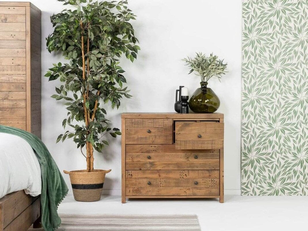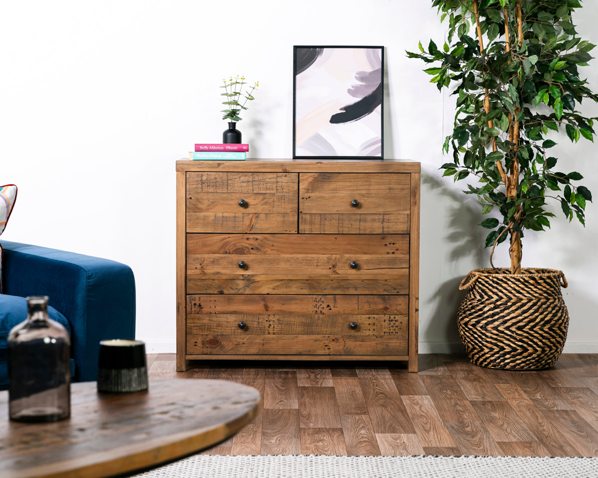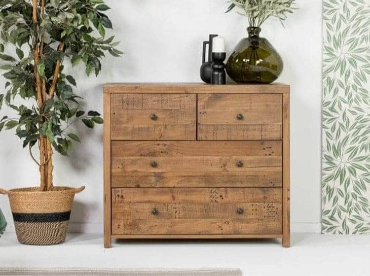 La commode Montréal 2/2 répond parfaitement à vos besoins de rangement. Dotée de deux petits et deux grands tiroirs, elle offre un espace généreux pour vos essentiels. Chaque tiroir est muni de poignées métalliques traditionnelles, rehaussant le charme rustique de la commode tout en assurant un accès facile à vos affaires.