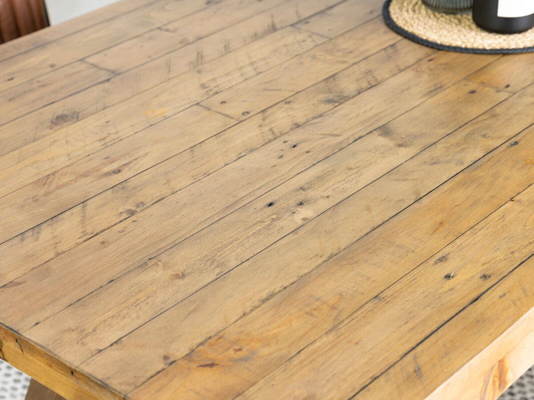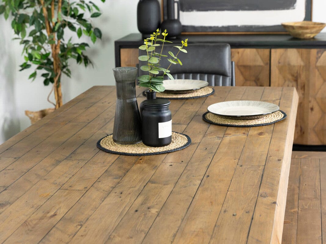 La palette de couleurs brun clair, associée à la riche finition chêne, crée une harmonie visuelle qui met en valeur la beauté intrinsèque du bois de récupération. Les motifs du grain, les nœuds et les textures deviennent des expressions poétiques de la nature, garantissant que chaque repas autour de la table à manger Pyramide soit imprégné d'une ambiance authentique et unique.