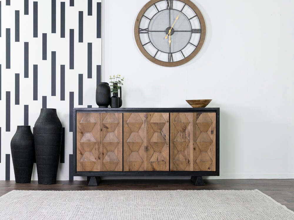 La palette de brun clair, harmonieusement associée à la riche finition chêne, confère au buffet Pyramid un charme exceptionnel. Le bois de récupération, avec ses veinures et ses imperfections naturelles, devient une toile d'authenticité, offrant un voyage visuel à travers l'histoire du renouveau et d'un mode de vie durable. Ce buffet est bien plus qu'un simple meuble de rangement : c'est un objet de conversation, un mariage harmonieux de forme et de fonction.