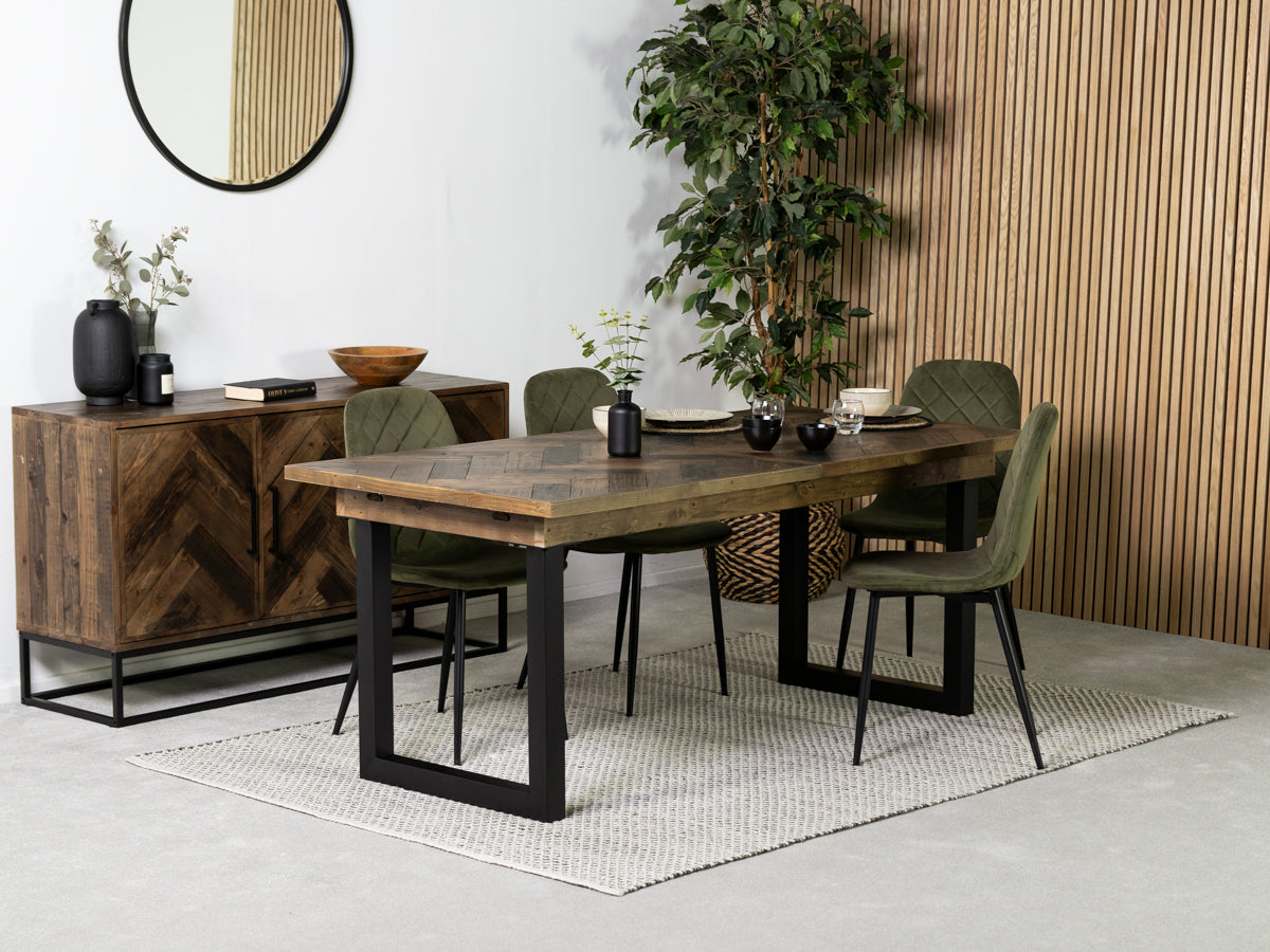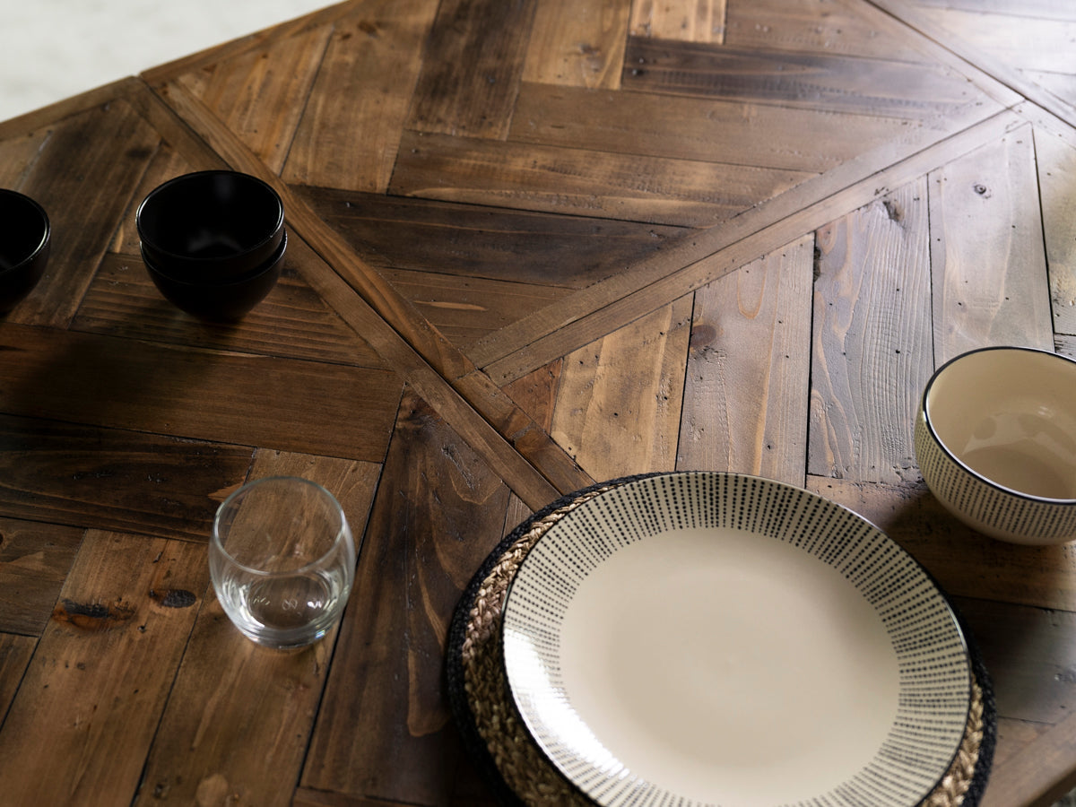La table à manger Tulsa Dark, fabriquée en bois massif recyclé, arbore une marqueterie à motif croisé audacieux et sa longueur est réglable de 180 cm à 240 cm, ce qui la rend idéale pour toutes les occasions, des dîners intimes aux grandes réceptions. Avec ses tons profonds, ses textures naturelles et sa fabrication durable, chaque table raconte une histoire unique, fruit d'un savoir-faire artisanal et d'une personnalité affirmée.
