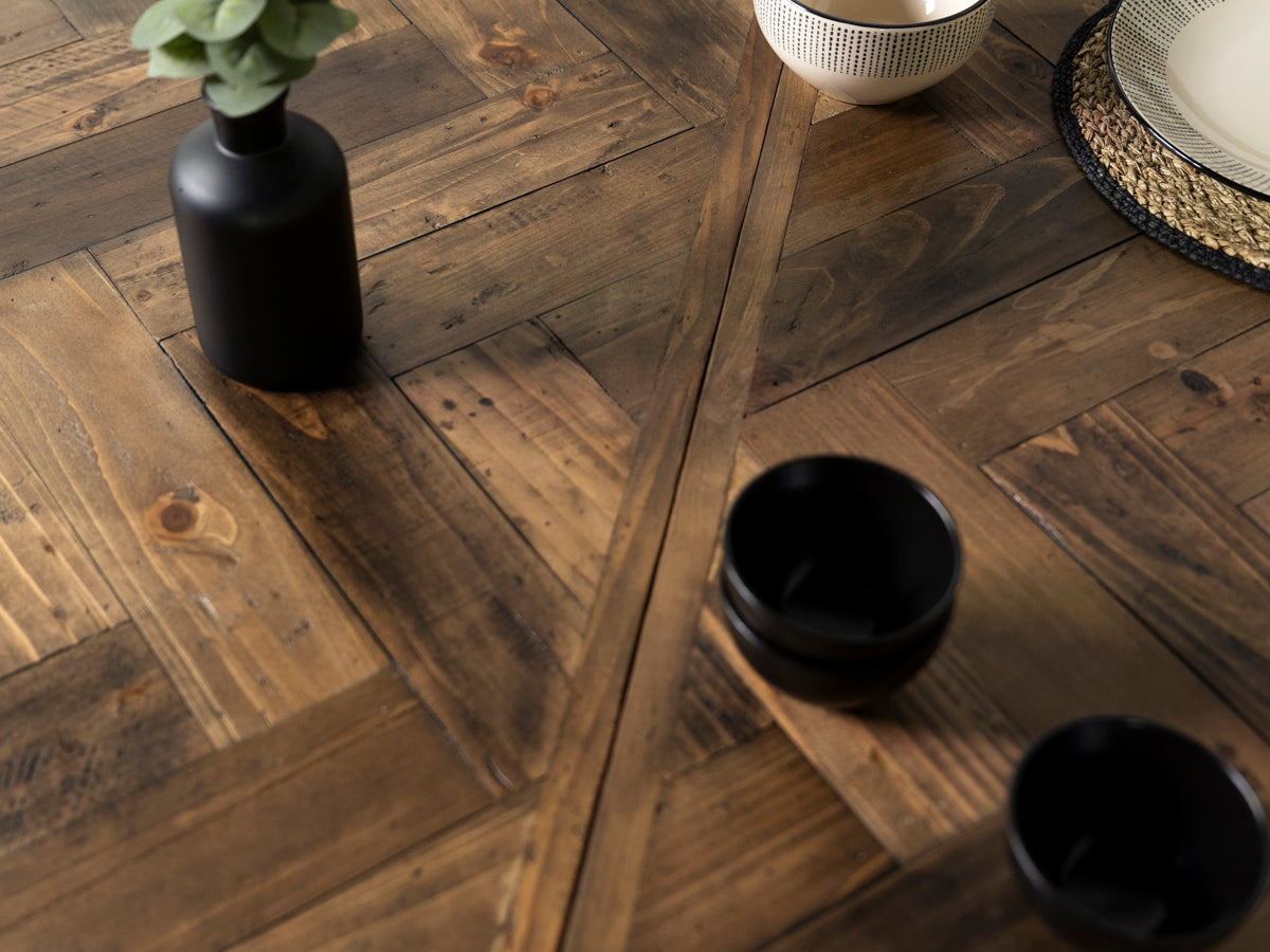 La table à manger Tulsa Dark se transforme facilement de 180 cm à 240 cm, idéale pour les repas de famille intimes ou les grandes réceptions. Fabriquée en bois massif recyclé, elle arbore une riche finition foncée et une marqueterie à motif croisé du plus bel effet. Chaque table est unique, révélant les nœuds naturels, les variations de veinage et le caractère distinctif du bois recyclé.