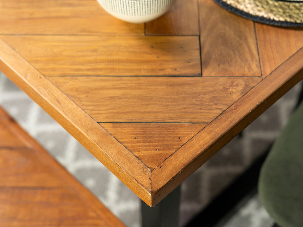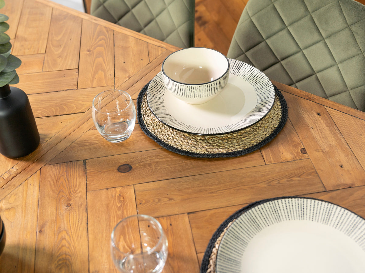 Au cœur de la collection, une table en bois recyclé ornée d'une marqueterie raffinée à motif croisé se décline dans une palette de tons naturels captivante. Cette fusion créative d'esthétique industrielle et de couleurs chaleureuses et authentiques crée une synergie remarquable qui caractérise véritablement la collection Tulsa.