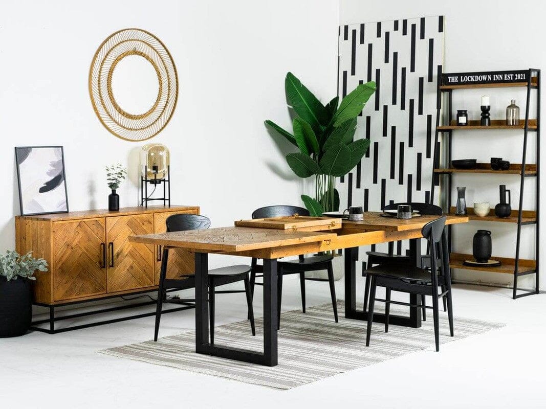Au cœur de la collection, une table en bois recyclé ornée d'une marqueterie raffinée à motif croisé se décline dans une palette de tons naturels captivante. Cette fusion créative d'esthétique industrielle et de couleurs chaleureuses et authentiques crée une synergie remarquable qui caractérise véritablement la collection Tulsa.