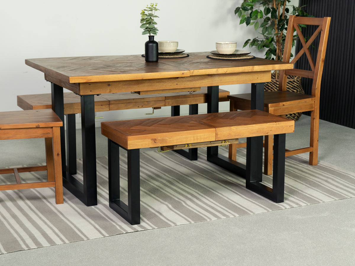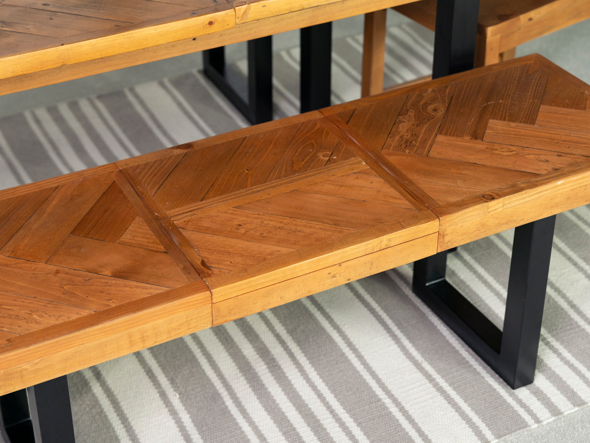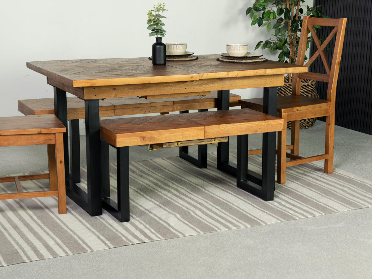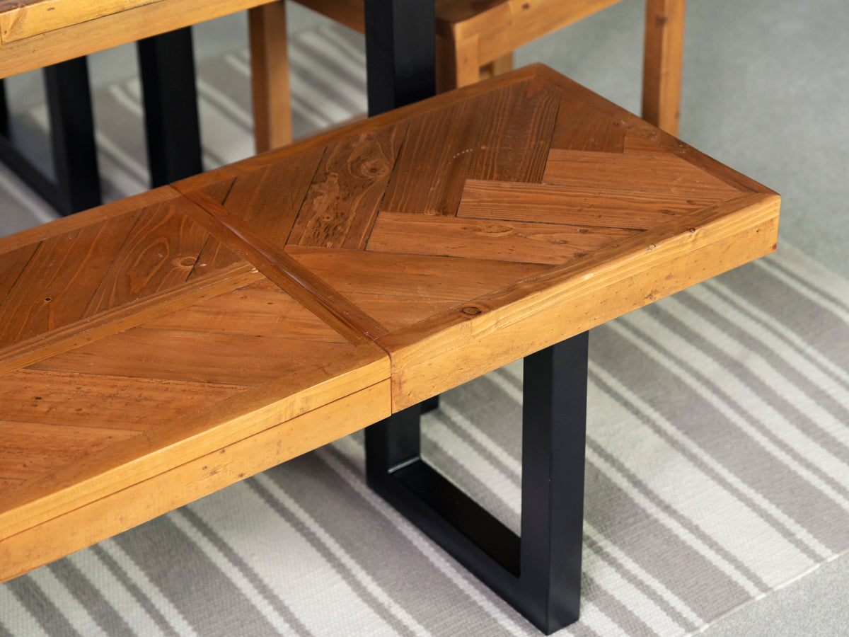 Découvrez le banc extensible Tulsa : une pièce maîtresse polyvalente qui allie le charme du bois recyclé à la praticité moderne. Fabriqué à la main à partir de véritable bois de récupération, chaque banc révèle des nœuds, des marques et un élégant motif de parquet à chevrons, conférant à chaque pièce un caractère et une histoire uniques.