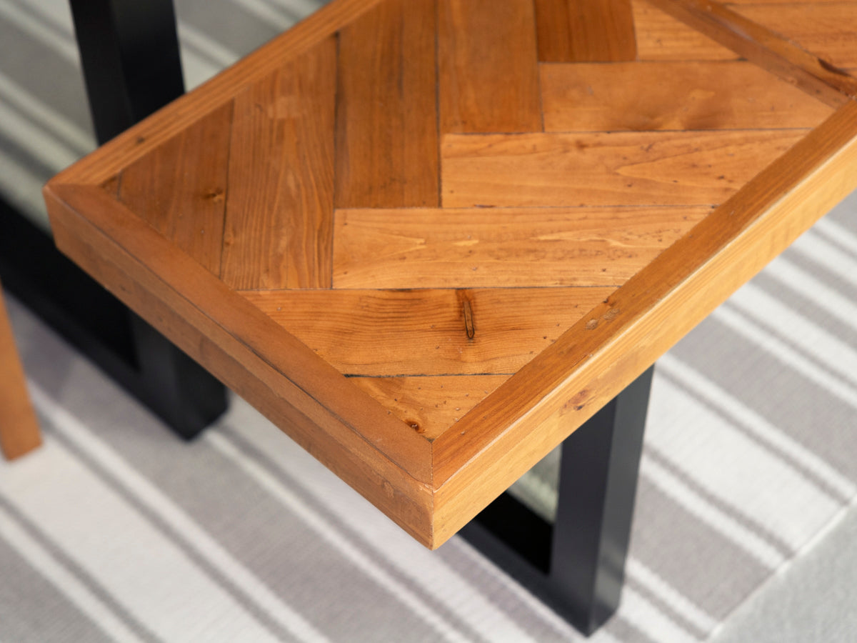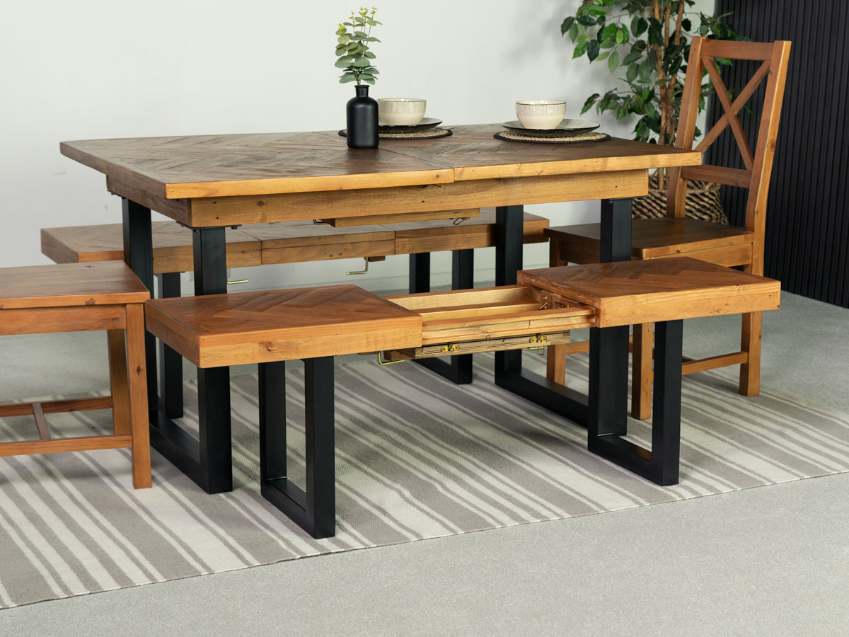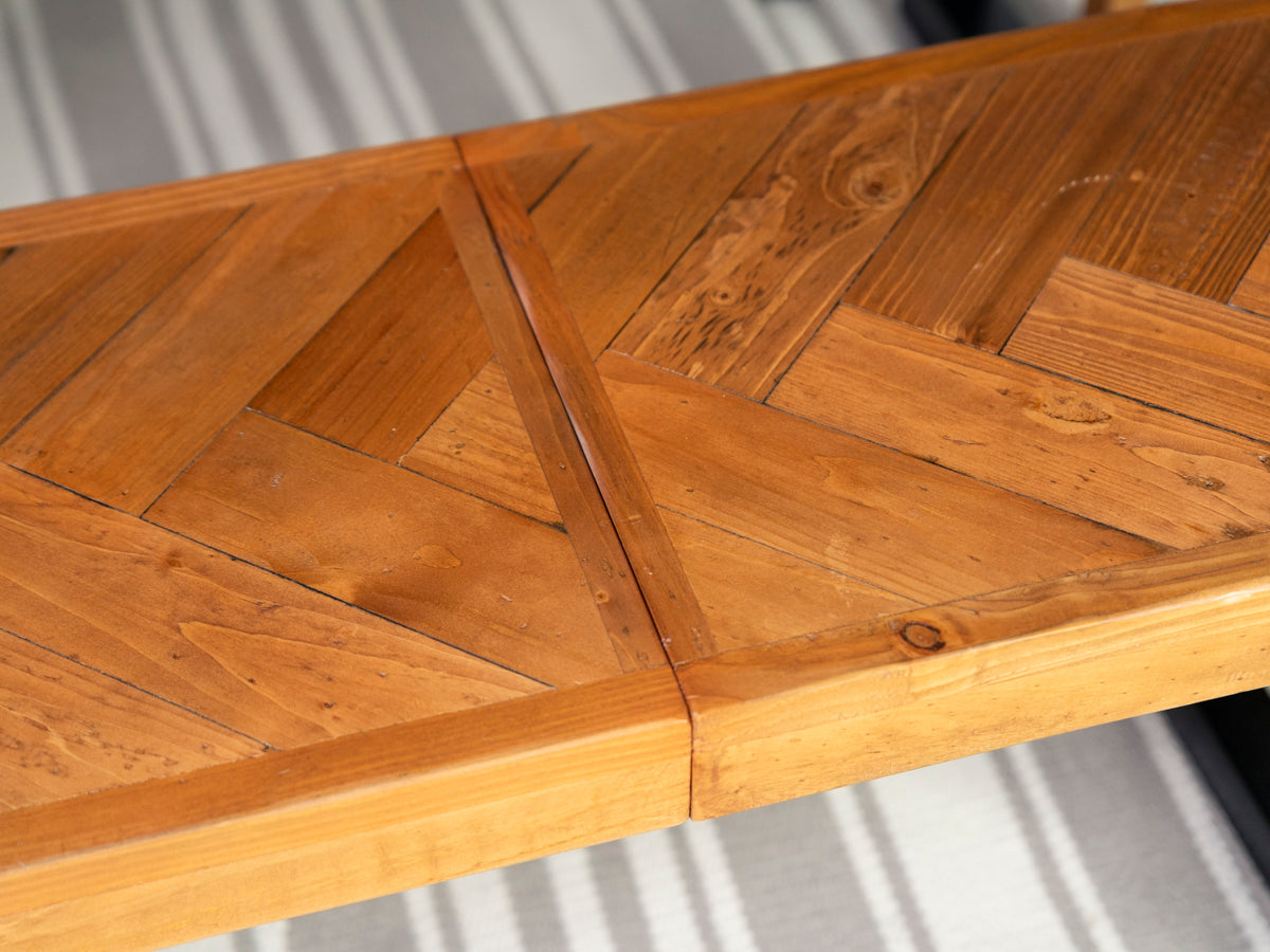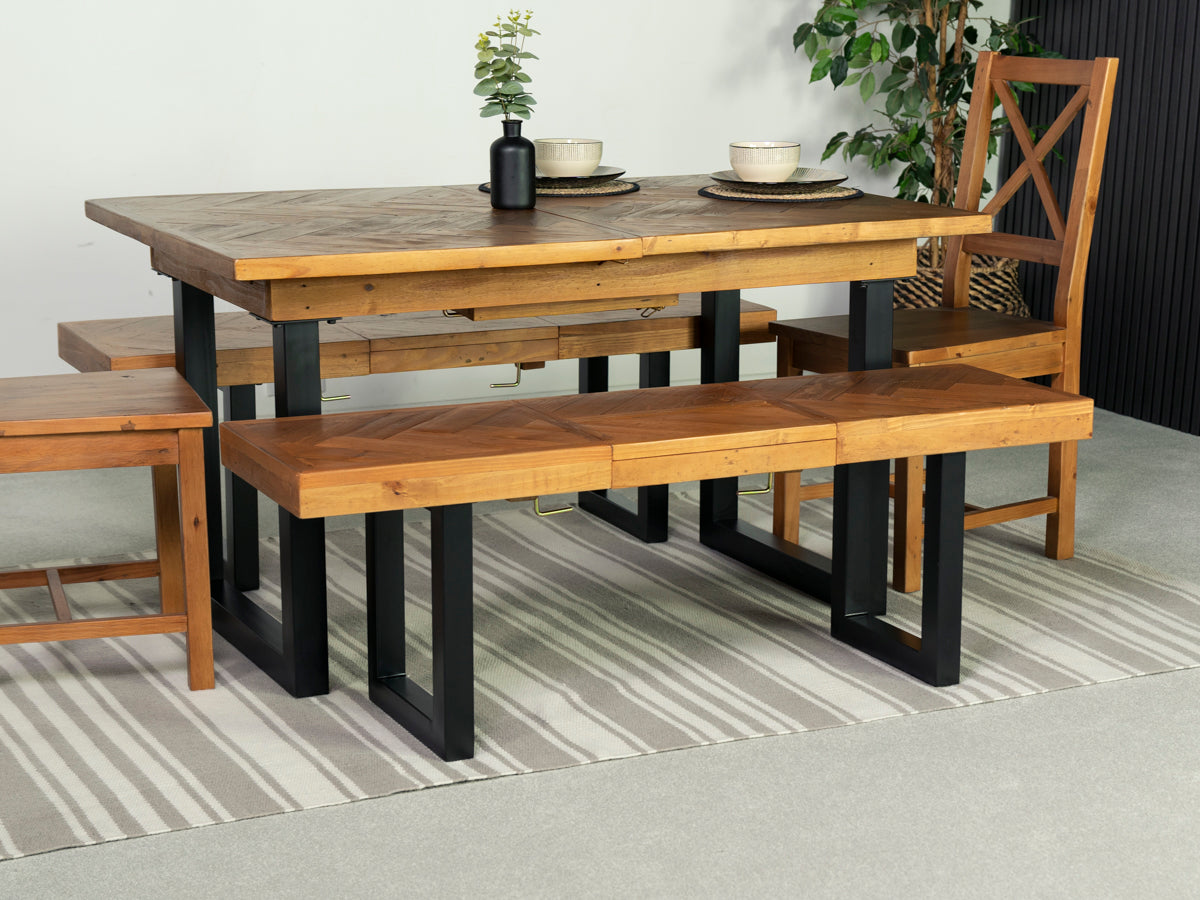 Découvrez le banc extensible Tulsa : une pièce maîtresse polyvalente qui allie le charme du bois recyclé à la praticité moderne. Fabriqué à la main à partir de véritable bois de récupération, chaque banc révèle des nœuds, des marques et un élégant motif de parquet à chevrons, conférant à chaque pièce un caractère et une histoire uniques.