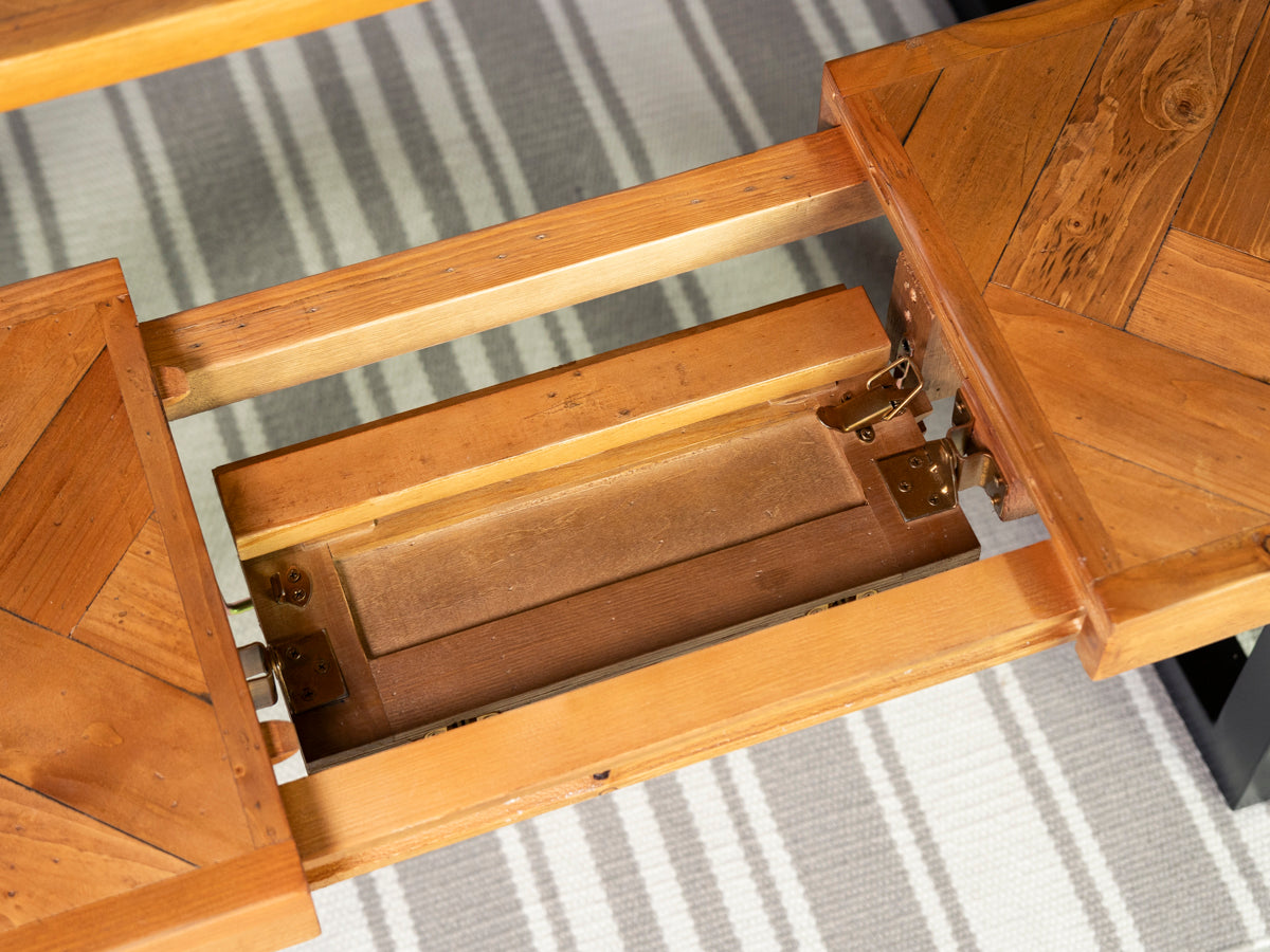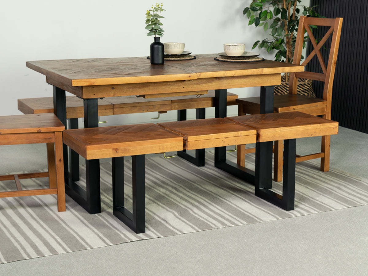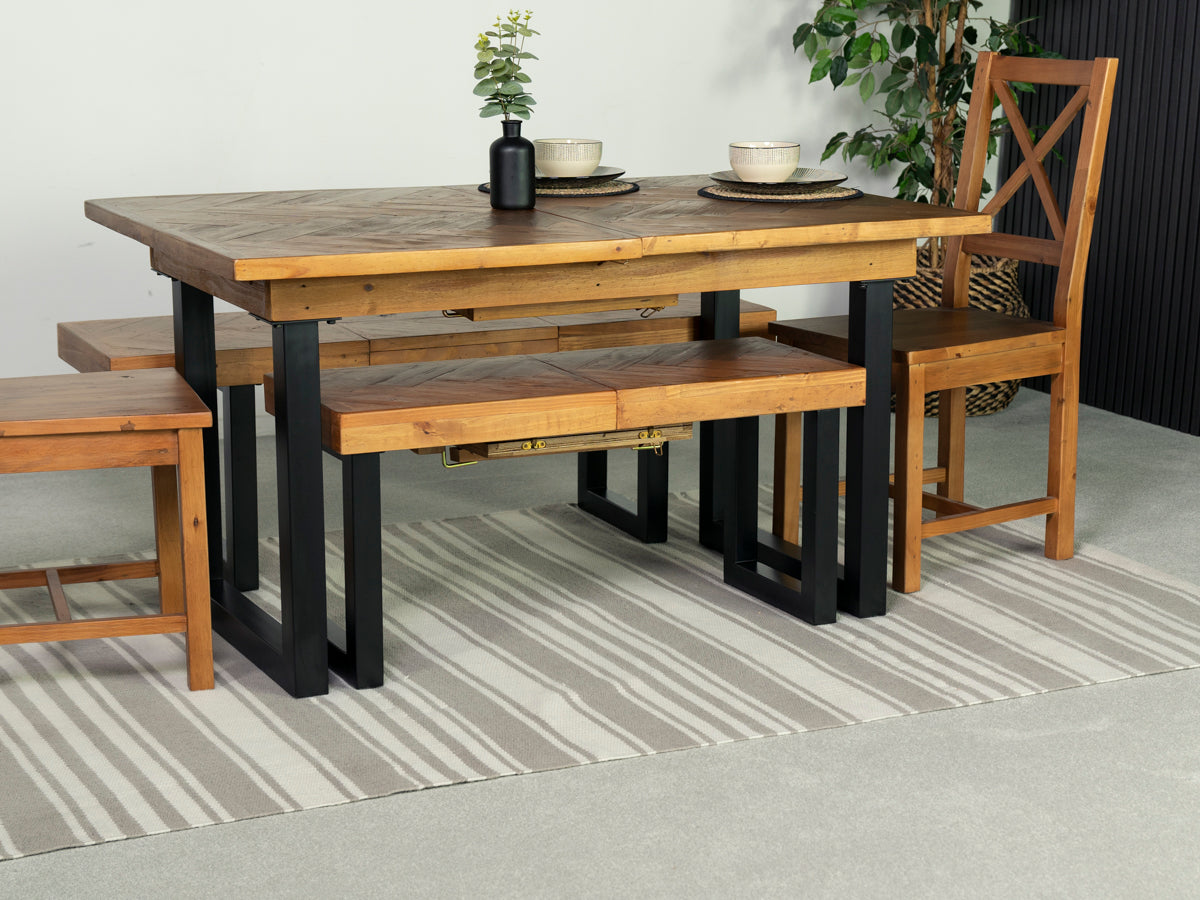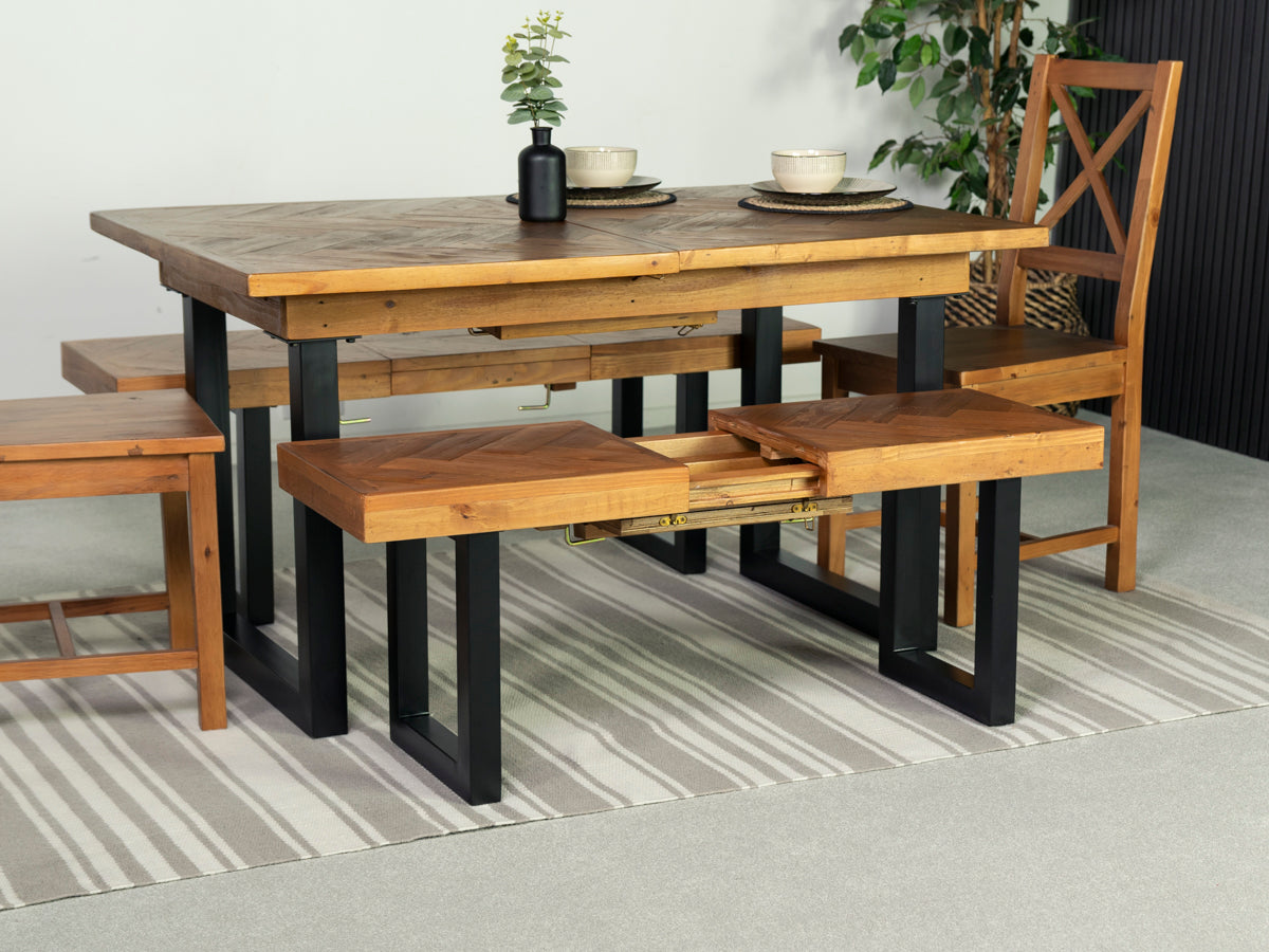 Découvrez le banc extensible Tulsa : une pièce maîtresse polyvalente qui allie le charme du bois recyclé à la praticité moderne. Fabriqué à la main à partir de véritable bois de récupération, chaque banc révèle des nœuds, des marques et un élégant motif de parquet à chevrons, conférant à chaque pièce un caractère et une histoire uniques.