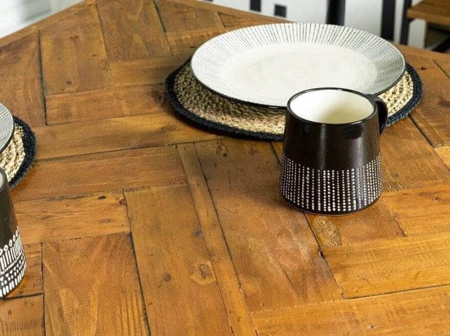 Sa conception robuste avec plateau fixe en fait une pièce maîtresse fiable, tandis que l'incrustation unique à motif croisé et les tons de bois naturels ajoutent une touche d'élégance rustique qui s'harmonise avec tous les styles de décoration, du style industriel moderne au style champêtre chic.